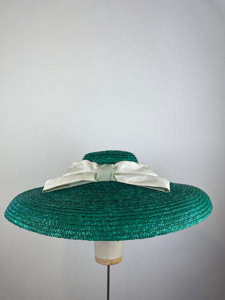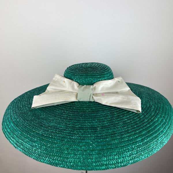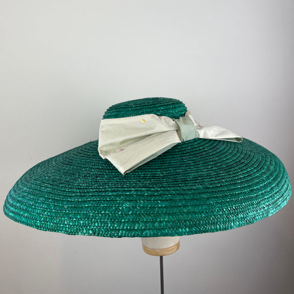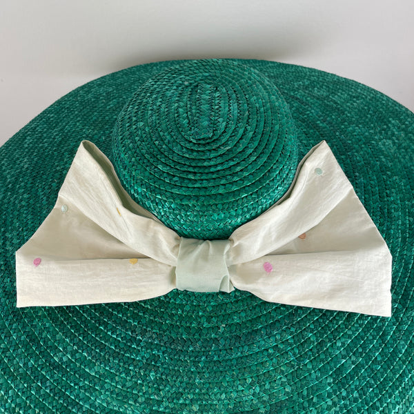 Dieser auffällige und farbenfrohe Sommerhut aus Naturstroh besticht durch seine zart gepunktete Seidenschleife. Ein Hut mit sonnigem, romantischem Flair.